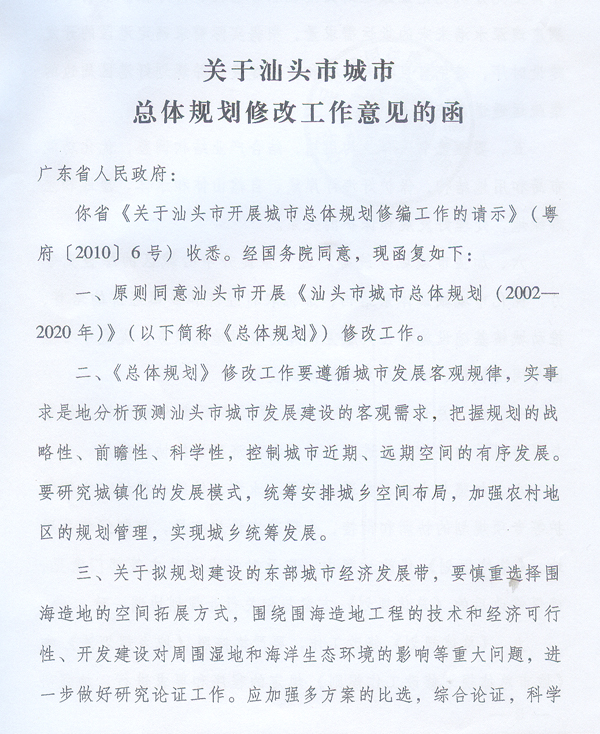 汕頭市人民政府,省住房城鄉(xiāng)建設(shè)廳: 現(xiàn)將住房和城鄉(xiāng)建設(shè)部《關(guān)于汕頭市城市總體規(guī)劃修改工作意見(jiàn)的函》(建規(guī)函〔2012〕42號(hào))轉(zhuǎn)發(fā)給你們,請(qǐng)遵照實(shí)施。 ? 廣東省人民政府 二○一二年四月九日