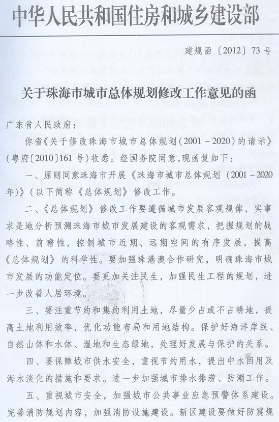 珠海市人民政府,省住房城鄉(xiāng)建設廳: 現(xiàn)將住房和城鄉(xiāng)建設部《關于珠海市城市總體規(guī)劃修改工作意見的函》(建規(guī)函〔2012〕73號)轉發(fā)給你們,請遵照實施。