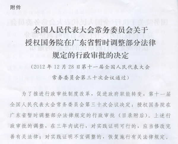 現將《國務院關于執行〈全國人民代表大會常務委員會關于授權國務院在廣東省暫時調整部分法律規定的行政審批的決定〉的通知》(國函〔2013〕9號)轉發給你們,請認真貫徹執行。 ? ? ? 廣東省人民政府 2013年2月7日