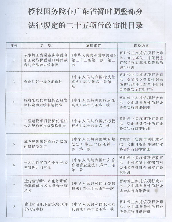 廣東省人民政府轉發國務院關于執行《全國 人民代表大會常務委員會關于授權國務院在 廣東省暫時調整部分法律規定的 行政審批的決定》的通知