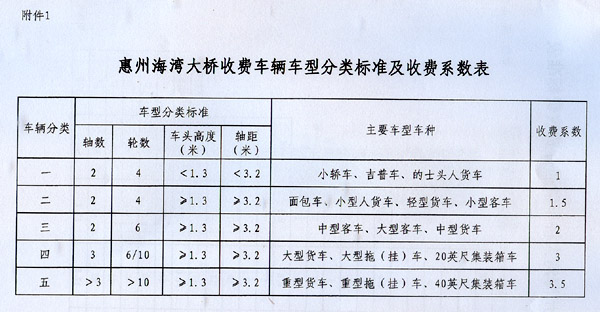 粵交費〔2014〕1649號請示收悉。同意惠州海灣大橋項目建成通車和收費站收費設施經驗收符合省聯網收費技術要求后開始收費,收費車型按全省高速公路統一標準,即按車輛軸(輪)數及車頭高度等物理參數進行分類,一至五類車的收費系數分別為1、1.5、2、3、3.5;凌坑至船澳段收費標準為0.45元/標準車公里,船澳至赤沙段收費標準為19元/標準車次。