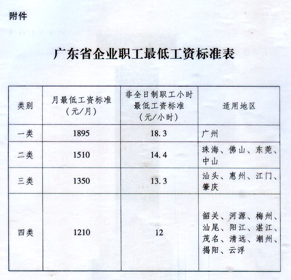 根據《中華人民共和國勞動法》和《最低工資規定》(原勞動保障部令第21號)的規定,結合我省經濟社會發展狀況,決定調整我省企業職工最低工資標準和非全日制職工小時最低工資標準。現將有關事項通知如下: 一、從2015年5月1日起,調整我省企業職工最低工資標準和非全日制職工小時最低工資標準,具體標準和適用地區見附件。各地級以上市原則上應統一執行省確定的標準,有條件的地區可在省確定的標準上適當上調標準,并報省人力資源社會保障廳備案。深圳市按《深圳市員工工資支付條例》執行。