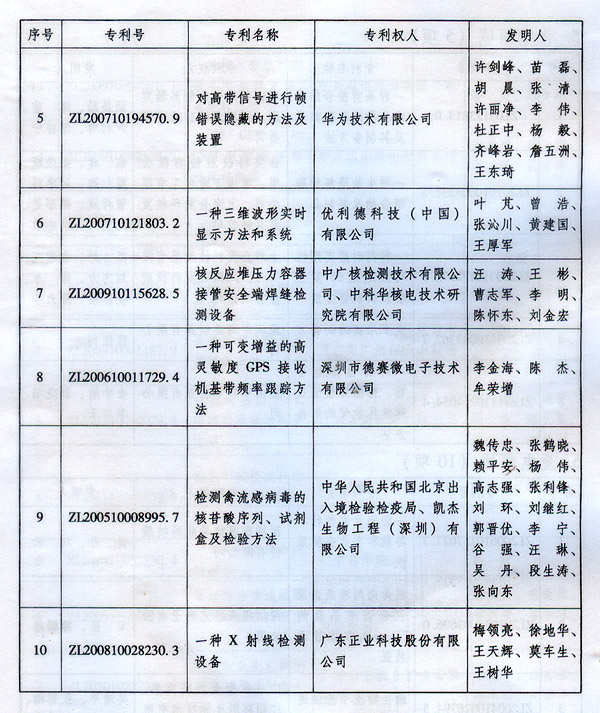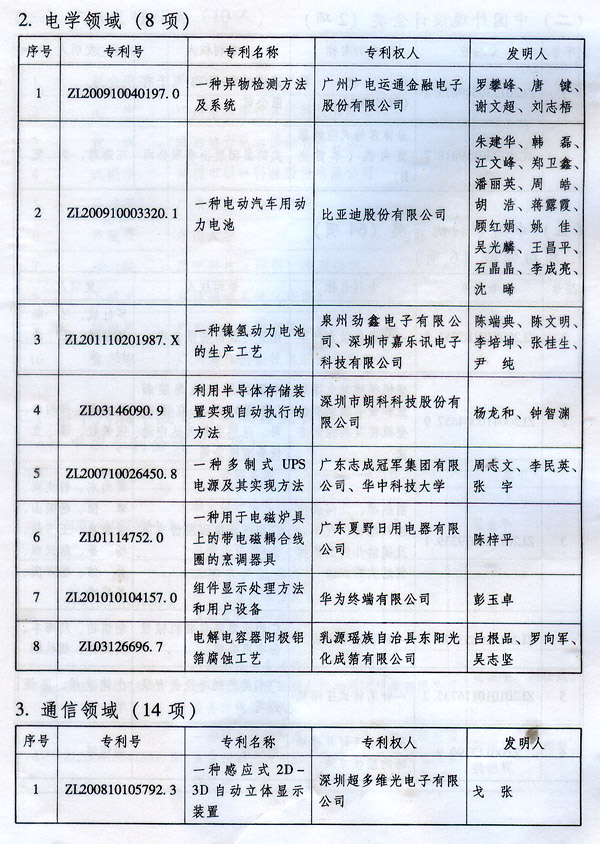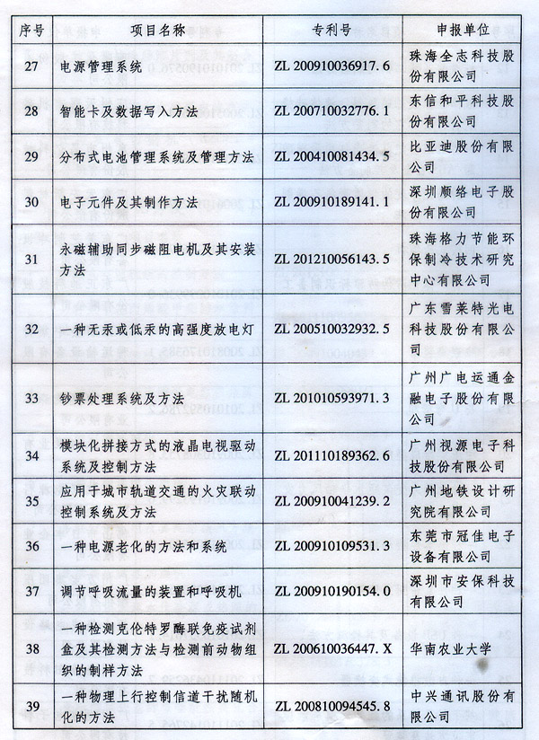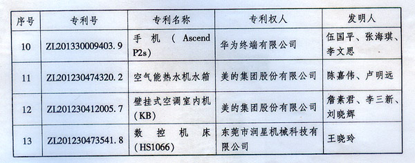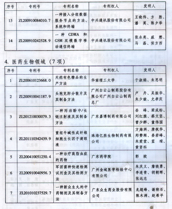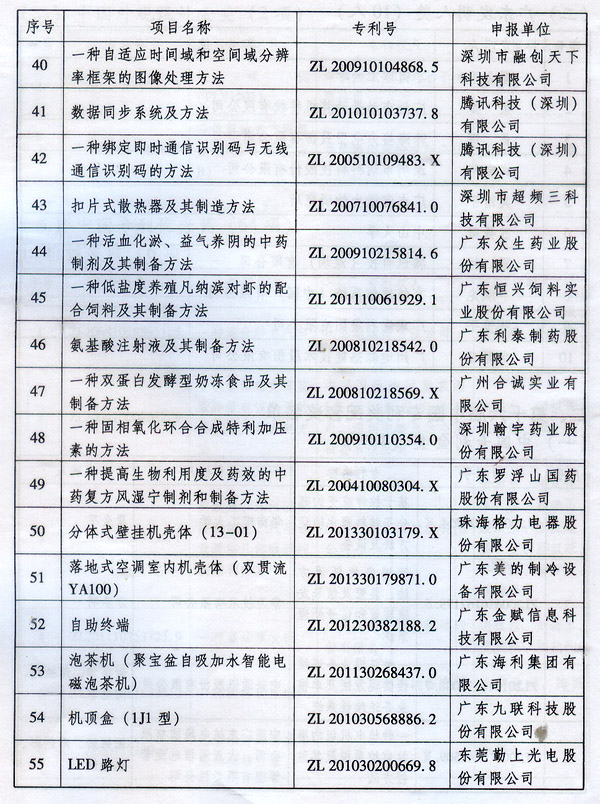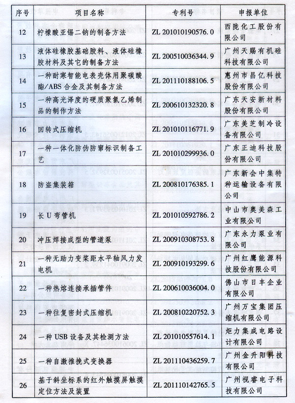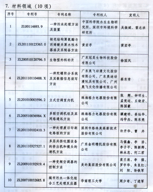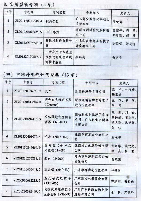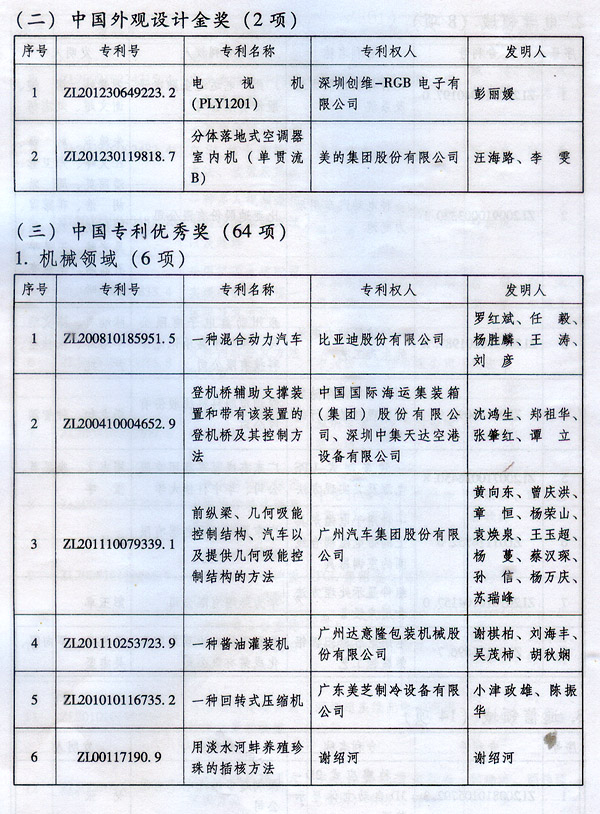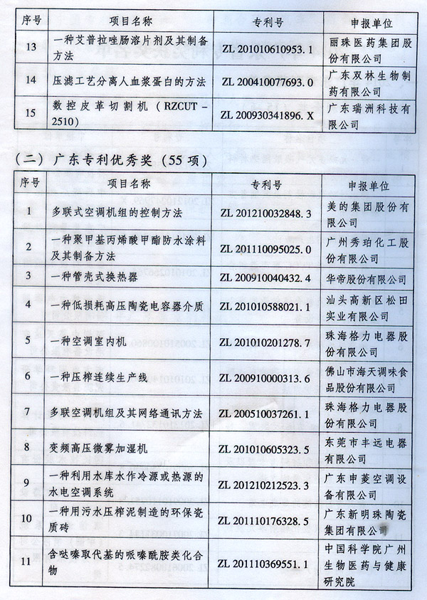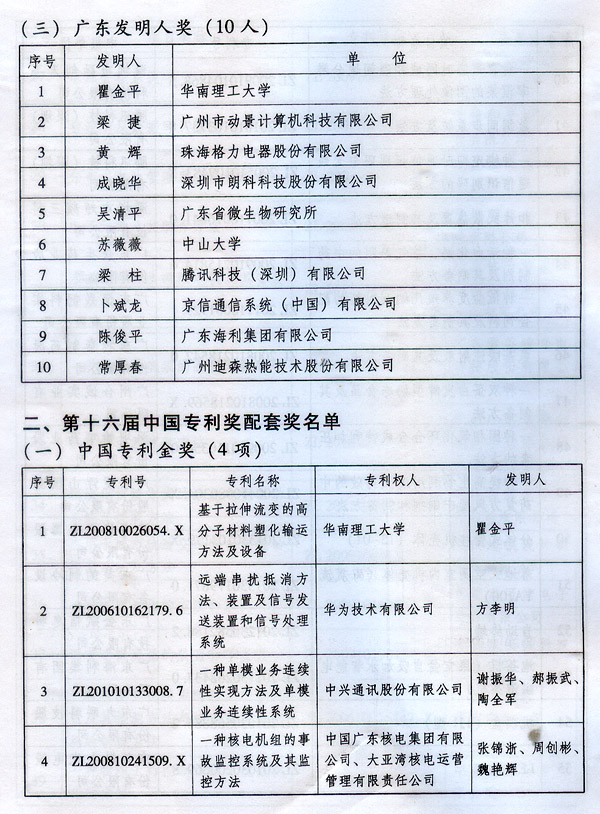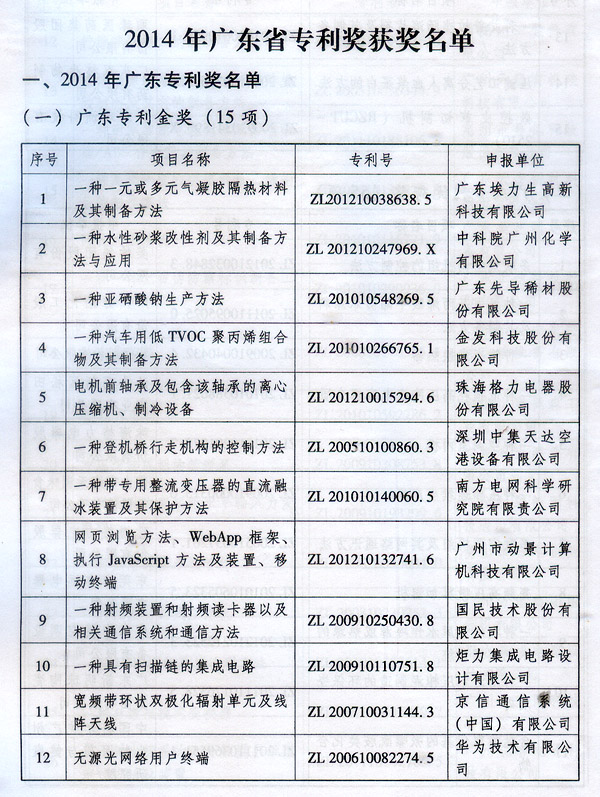 ? 廣東省人民政府關(guān)于表彰2014年廣東省 專利獎(jiǎng)單位和個(gè)人的通報(bào) ? 各地級(jí)以上市人民政府,各縣(市、區(qū))人民政府,省政府各部門、各直屬機(jī)構(gòu): 根據(jù)《廣東省專利獎(jiǎng)勵(lì)辦法》(粵府令第202號(hào)規(guī)定),經(jīng)廣東專利獎(jiǎng)評(píng)審委員會(huì)評(píng)審,省知識(shí)產(chǎn)權(quán)局審核,省政府決定授予“一種一元或多元?dú)饽z隔熱材料及其制備方法”等15項(xiàng)專利為2014年廣東專利金獎(jiǎng),給予每項(xiàng)10萬元的獎(jiǎng)勵(lì);授予“多聯(lián)式空調(diào)機(jī)組的控制方法”等55項(xiàng)專利為2014年廣東專利優(yōu)秀獎(jiǎng),給予每項(xiàng)5萬元的獎(jiǎng)勵(lì);授予瞿金平等10位發(fā)明人2014年廣東發(fā)明人獎(jiǎng),給予每人2萬元的獎(jiǎng)勵(lì);對(duì)我省獲得第十六屆中國專利金獎(jiǎng)的“基于拉伸流變的高分子材料塑化輸運(yùn)方法及設(shè)備”等4項(xiàng)專利、獲得第十六屆中國外觀設(shè)計(jì)金獎(jiǎng)的“電視機(jī)(PLY1201)”等2項(xiàng)專利給予每項(xiàng)100萬元獎(jiǎng)勵(lì),對(duì)我省獲得第十六屆中國專利優(yōu)秀獎(jiǎng)的“一種混合動(dòng)力汽車”等64項(xiàng)專利、獲得第十六屆中國外觀設(shè)計(jì)優(yōu)秀獎(jiǎng)的“汽車”等13項(xiàng)專利給予每項(xiàng)50萬元獎(jiǎng)勵(lì)。