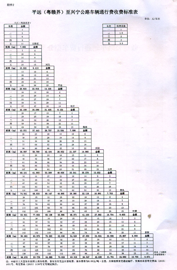 粵交費(fèi)〔2015〕1207號(hào)請(qǐng)示收悉。同意平遠(yuǎn)(粵贛界)至興寧公路建成通車和收費(fèi)站收費(fèi)設(shè)施經(jīng)驗(yàn)收符合省聯(lián)網(wǎng)收費(fèi)技術(shù)要求后開始收費(fèi),收費(fèi)車型按國家統(tǒng)一標(biāo)準(zhǔn)進(jìn)行分類,一至五類車的收費(fèi)系數(shù)分別為1、1.5、2、3、3.5,收費(fèi)標(biāo)準(zhǔn)為0.45元/標(biāo)準(zhǔn)車公里;貨車實(shí)行完全計(jì)重收費(fèi),基本費(fèi)率為0.09元/噸·公里。