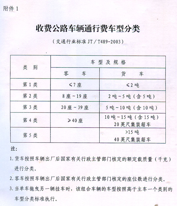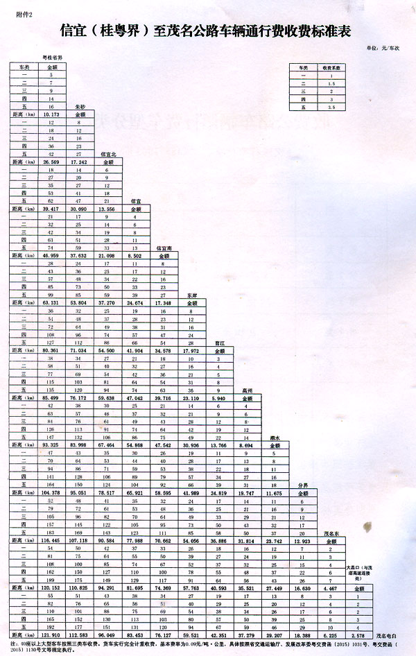 粵交費〔2015〕1200號請示收悉。同意信宜(桂粵界)至茂名公路建成通車和收費站收費設(shè)施經(jīng)驗收符合省聯(lián)網(wǎng)收費技術(shù)要求后開始收費,收費車型按國家統(tǒng)一標準進行分類,一至五類車的收費系數(shù)分別為1、1.5、2、3、3.5,收費標準為0.45元/標準車公里;貨車實行完全計重收費,基本費率為0.09元/噸·公里。