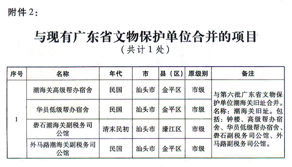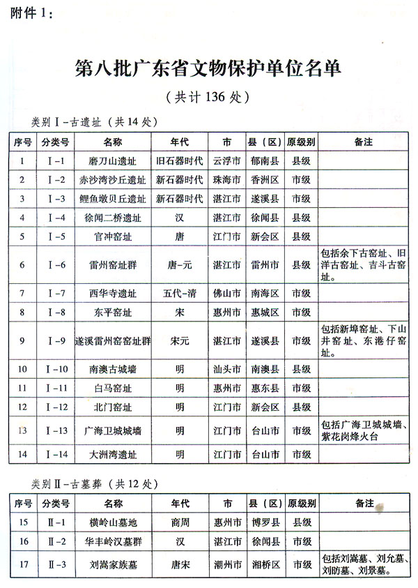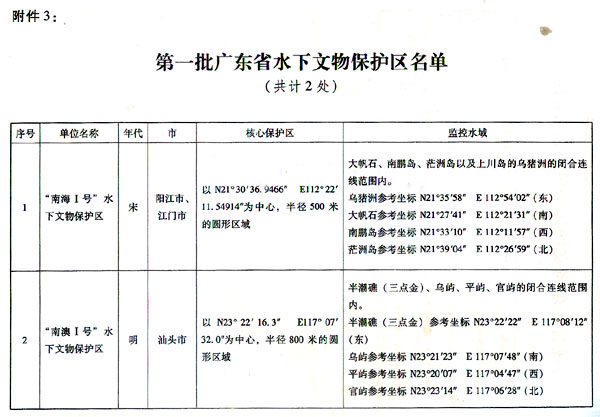 根據《中華人民共和國文物保護法》有關規定和第八批廣東省文物保護單位和第一批廣東省水下文物保護區評估委員會評估意見,省人民政府同意省文化廳確定的第八批廣東省文物保護單位(共計136處)和第一批廣東省水下文物保護區(共計2處),現予以公布。各地、各部門要按照國家和省有關法規和政策要求,認真貫徹落實“保護為主、搶救第一、合理利用、傳承發展”的工作方針,切實做好文物的保護、利用和管理工作。 2.與現有廣東省文物保護單位合并的項目 3.第一批廣東省水下文物保護區名單 ? ? 廣東省人民政府 2015年12月10日 ? ?