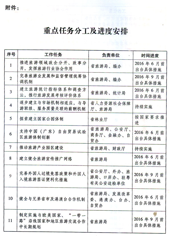 (一)深化旅游綜合改革。加快推進旅游領域政企分開、政事分開,進一步發(fā)揮旅游行業(yè)協(xié)會作用,加強事中、事后監(jiān)管。完善旅游業(yè)發(fā)展和管理統(tǒng)籌協(xié)調(diào)機制,促進旅游資源要素優(yōu)化配置。深入實施《珠江三角洲地區(qū)旅游一體化規(guī)劃》,發(fā)揮廣州作為全國旅游綜合改革試點城市的引領作用,推進珠三角地區(qū)打造全國旅游綜合改革創(chuàng)新示范先行區(qū),加快推進省級旅游綜合改革示范市和示范縣(區(qū))的改革創(chuàng)新工作。積極爭取國家支持我省探索休假制度改革,探索建立國家公園體制。深化導游管理體制改革,逐步建立與市場機制相適應,與導游職級、服務質(zhì)量相關聯(lián)的薪酬機制。建立旅游統(tǒng)計指標體系和旅游發(fā)展考核評價體系,推動實現(xiàn)旅游衛(wèi)星賬戶模式常態(tài)化。加大中國(廣東)自由貿(mào)易試驗區(qū)旅游體制創(chuàng)新力度,支持區(qū)內(nèi)港澳獨資旅行社經(jīng)營內(nèi)地居民出國(境)(不含臺灣地區(qū))團隊旅游業(yè)務。?