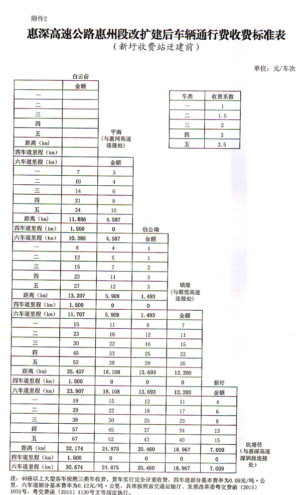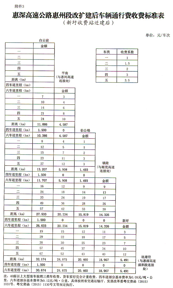 ? 廣東省人民政府關(guān)于惠深高速公路惠州段 調(diào)整車輛通行費收費標(biāo)準(zhǔn)有關(guān)問題的批復(fù) ? 省交通運輸廳、發(fā)展改革委: 粵交費〔2016〕135號請示收悉。同意惠深高速公路惠州段改擴(kuò)建工程交工驗收通車和收費站收費設(shè)施經(jīng)驗收符合省聯(lián)網(wǎng)收費技術(shù)要求后調(diào)整車輛通行費收費標(biāo)準(zhǔn),收費車型按國家統(tǒng)一標(biāo)準(zhǔn)進(jìn)行分類,1至5類車的收費系數(shù)分別為1、1.5、2、3、3.5,改擴(kuò)建段(30.674公里)收費標(biāo)準(zhǔn)調(diào)整為0.6元/標(biāo)準(zhǔn)車公里,起點段(1.5公里)收費標(biāo)準(zhǔn)保持0.45元/標(biāo)準(zhǔn)車公里不變;貨車實行完全計重收費,改擴(kuò)建段(30.674公里)基本費率調(diào)整為0.12元/噸。公里,起點段(1.5公里)基本費率保持0.09元/噸。公里不變。