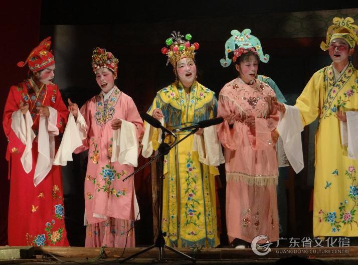 封開采茶戲傳統(tǒng)劇目以本地傳說、日常勞動(dòng)生活和男女相悅等故事的連臺(tái)本戲?yàn)橹鳎追Q“連戲”。腳色行當(dāng)分生、旦、丑三行,每個(gè)行當(dāng)又有若干分支,各有其基本固定的扮演人物和表演特色。生行主要以書生居多,也有老生、娃娃生等,表演唱、做、念、舞并重;旦行分花旦、正旦、老旦、搖旦四類;丑行分正丑、爛丑、褶子丑三類。化妝非常簡(jiǎn)樸,基本上是用蛋白粉和大紅紙沾水化妝,女演員一般化彎月眉、鳳眼、朱唇;男演員除了丑行腳色要勾畫八字眉、八字胡須、三角眼和白鼻子,其他行當(dāng)都是薄施脂粉,略微勾畫眉眼,唇部涂點(diǎn)紅色,兩顴擦少許胭脂,便登場(chǎng)演出。表演比較粗疏,只有簡(jiǎn)單的步法和手法,以唱述故事情節(jié)為主。演出時(shí)生、旦、丑三行全體先出場(chǎng)引唱,致祝福詞和介紹劇情提要,接著正戲開場(chǎng),終場(chǎng)再全體禮唱拜別。其表演藝術(shù)具有“生活化”的特色,表演步法、動(dòng)作和對(duì)白、唱腔都直接采用日常生活中的方式,較少戲劇化夸張。