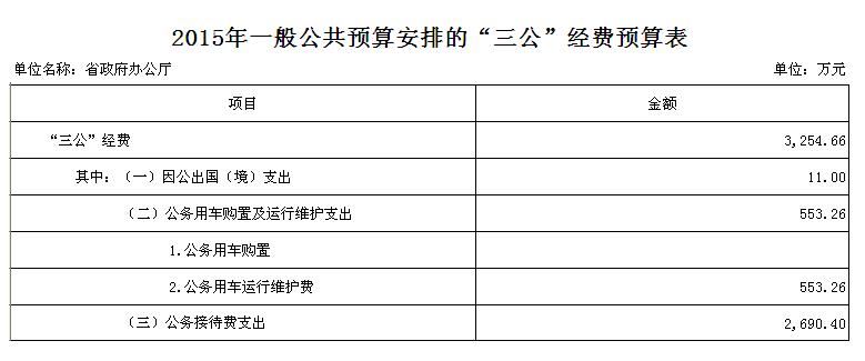 2015年一般公共預算安排的“三公”經費預算數為3,254.66萬元,其中:因公出國(境)支出預算11.00萬元;公務用車購置及運行維護支出預算553.26萬元(本年度此項支出預算全部為公務用車運行維護費);公務接待費支出預算2,690.40萬元。