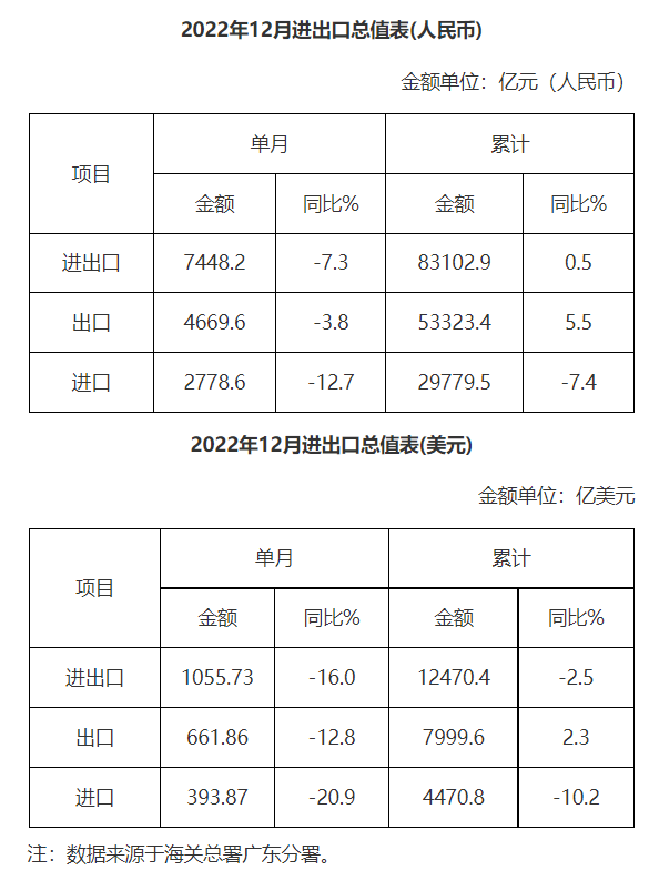 廣東省外貿進出口總值表(2022年12月)