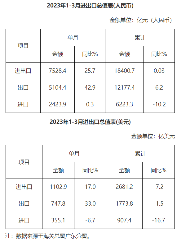 廣東省外貿進出口總值表(2023年1-3月)